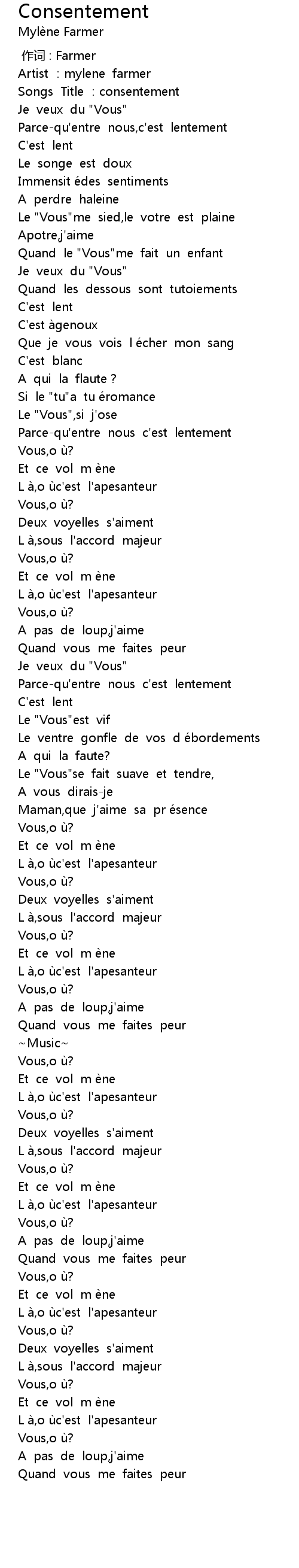 | [00:05.08] | Songs Title :consentement |