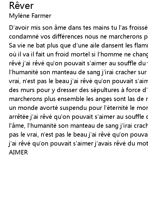 | Sa vie ne bat plus que d' une aile dansent les flammes, les bras se lè vent là où il va il fait un froid mortel si l' homme ne change de ciel pourtant, j' ai r vé j' ai r vé qu' on pouvait s' aimer au souffle du vent s'é levait l' me, l' humanité son manteau de sang j' irai cracher sur vos tombeaux n' est pas le vrai, n' est pas le beau j' ai r vé qu' on pouvait s' aimer à quoi bon abattre des murs pour y dresser des sé pultures à force d' ignorer la tolé rance nous ne marcherons plus ensemble les anges sont las de nous veiller nous laissent comme un monde avorté suspendu pour l'é ternité le monde comme une pendule qui s' est arr té e j' ai r vé qu' on pouvait s' aimer au souffle du vent s'é levait l' me, l' humanité son manteau de sang j' irai cracher sur vos tombeaux n' est pas le vrai, n' est pas le beau j' ai r vé qu' on pouvait s' aimer Refrain x2 j' ai r vé qu' on pouvait s' aimer j' avais r vé du mot | |