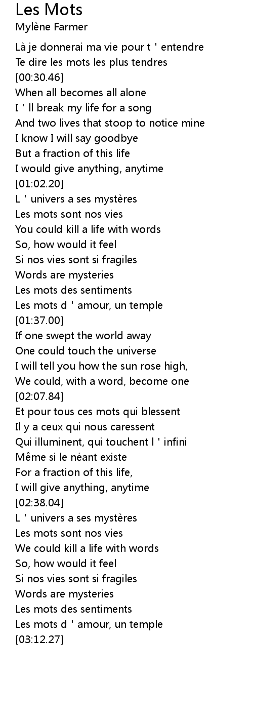 | [02:08.89] | Et pour tous ces mots qui blessent |