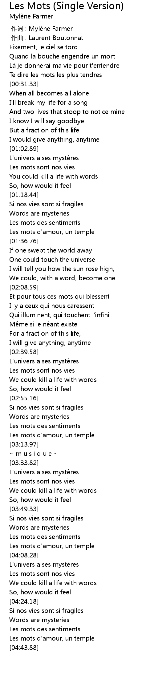| [00:00.000] | zuo ci : Myle ne Farmer |
