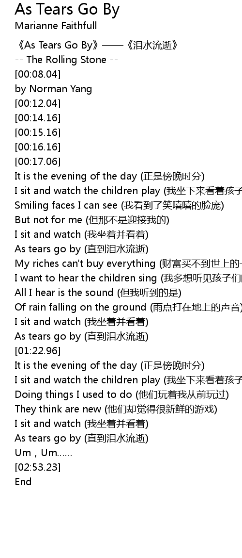 | [00:01.00] | 《As Tears Go By》——《泪水流逝》 |