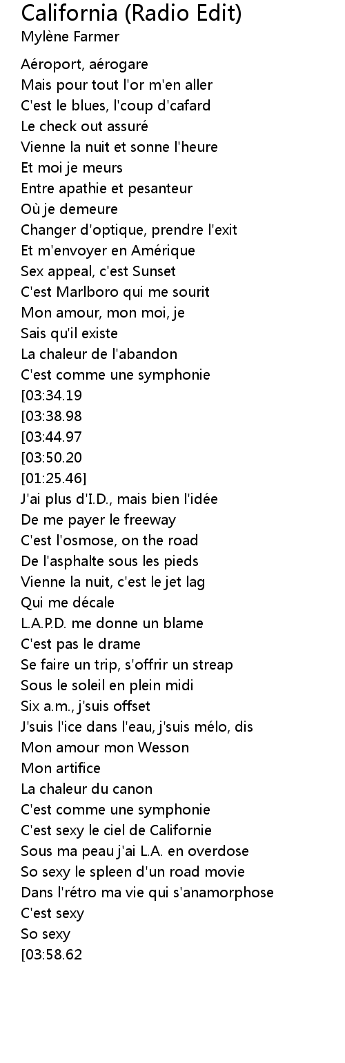| [04:18.31][03:34.19][03:11.09][01:01.62] | C'est sexy le ciel de Californie |