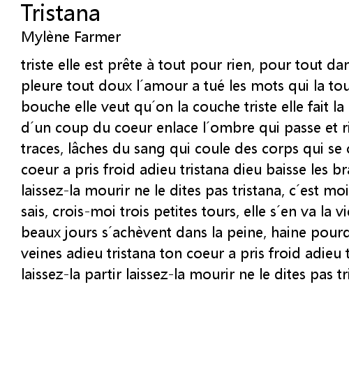 | triste elle est pr te à tout pour rien, pour tout dans la ronde des fous elle pleure tout doux l amour a tué les mots qui la touchent, touchent contre ta bouche elle veut qu on la couche triste elle fait la grimace, devant sa glace d un coup du coeur enlace l ombre qui passe et rien jamais n effacera les traces, l ches du sang qui coule des corps qui se cassent adieu tristana ton coeur a pris froid adieu tristana dieu baisse les bras laissezla partir laissezla mourir ne le dites pas tristana, c est moi! triste sort tristana tu sais, croismoi trois petites tours, elle s en va la vie comme a les plus beaux jours s achè vent dans la peine, haine pourquoi fautil payer de ses veines adieu tristana ton coeur a pris froid adieu tristana dieu baisse les bras laissezla partir laissezla mourir ne le dites pas tristana, c est moi |