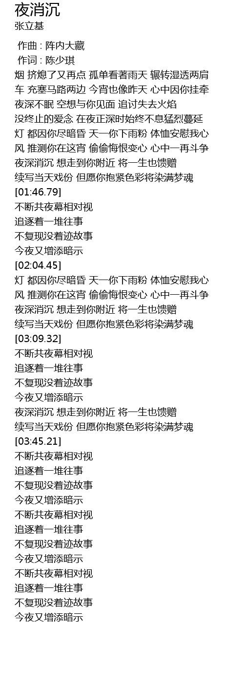| [02:52.77] | 夜深消沉 想走到你附近 将一生也馈赠 |