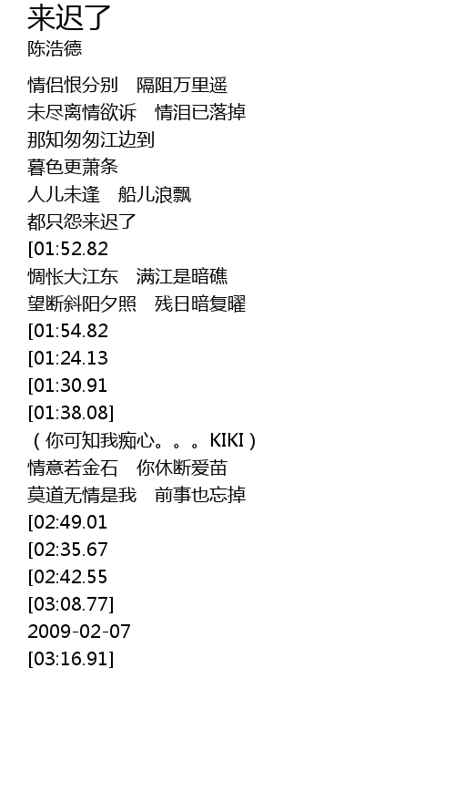 | [02:06.77][01:30.91] | 情随浪飘 都只怨来迟了 |