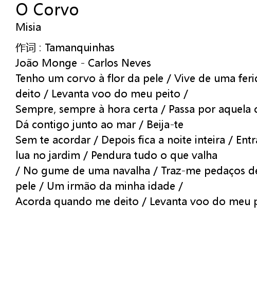 | Tenho um corvo à flor da pele / Vive de uma ferida aberta / Acorda quando me deito / Levanta voo do meu peito / | |
