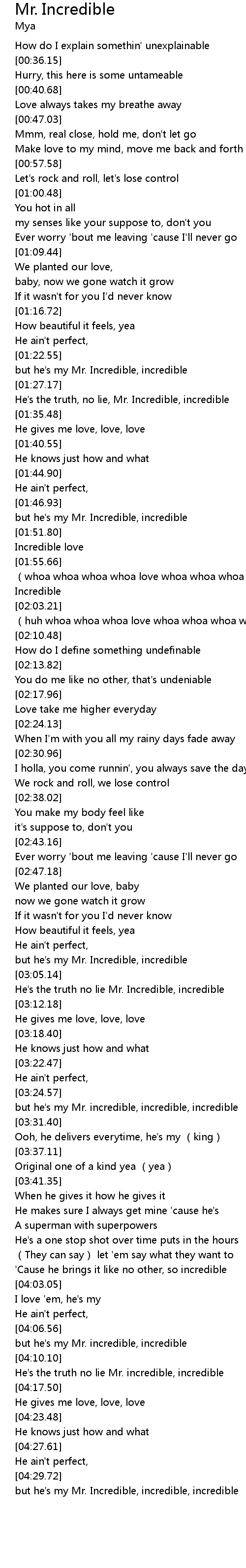 | [03:00.66] | but he's my Mr. Incredible, incredible |
