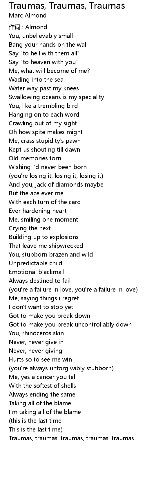 | Song | Traumas, Traumas, Traumas |