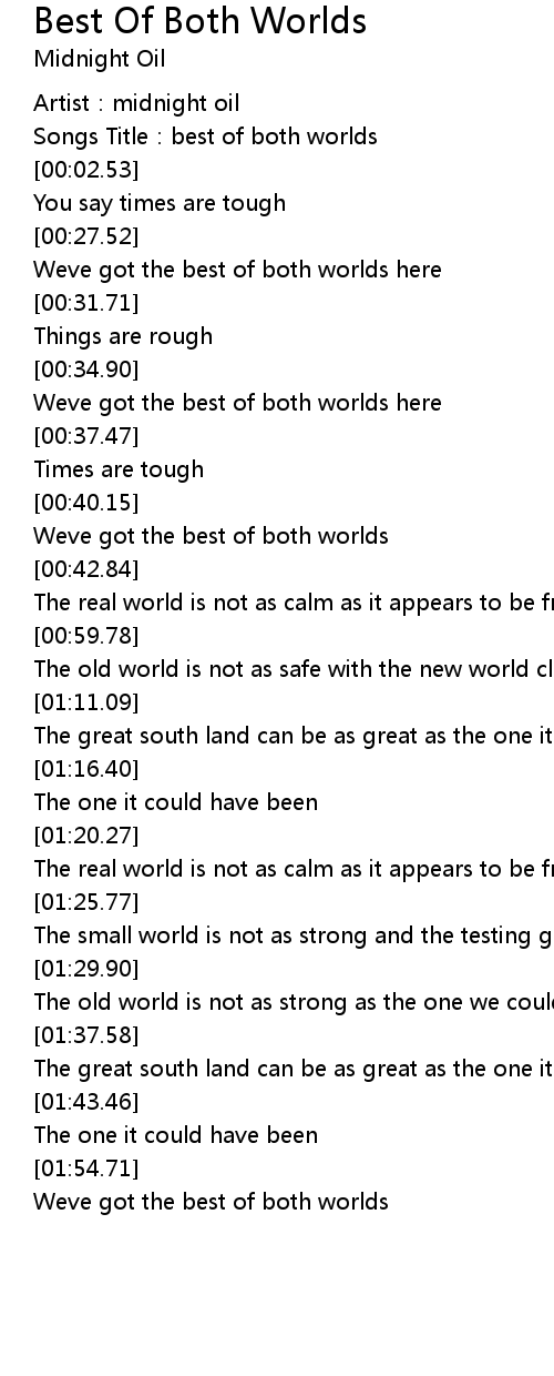 | [01:58.09] | Weve got the best of both worlds |