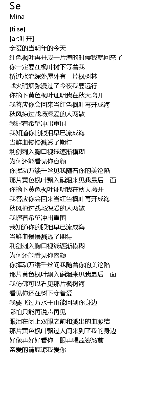 | [00:23.626] | 红色枫叶再开成一片海的时候我就回来了 |