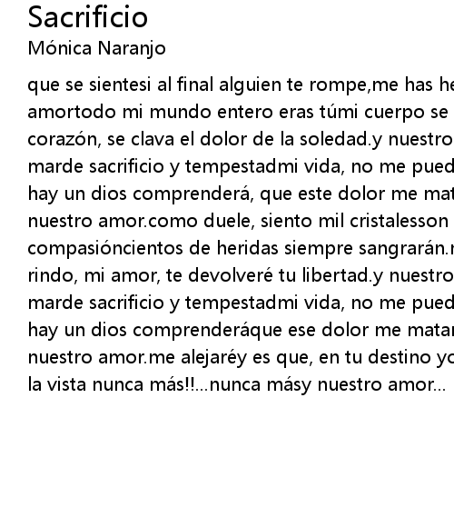 | que se sientesi al final alguien te rompe, me has herido el filo, de nuestro amortodo mi mundo entero eras tu mi cuerpo se muere si no esta tu luzen mi corazo n, se clava el dolor de la soledad. y nuestro amor, se ha perdido en un marde sacrificio y tempestadmi vida, no me puedo salvarrezo por nuestro amor. si hay un dios comprendera, que este dolor me matara oh, oh, por nuestro amor, por nuestro amor. como duele, siento mil cristalesson tus dulces besos, tu compasio ncientos de heridas siempre sangrara n. mi sacrificio es tu felicidadme rindo, mi amor, te devolvere tu libertad. y nuestro amorse ha perdido en un marde sacrificio y tempestadmi vida, no me puedo salvarrezo por nuestro amorsi hay un dios comprendera que ese dolor me matara oh, oh, por nuestro amor, por nuestro amor. me alejare y es que, en tu destino yo no estaba escritano volvere la vista nunca ma s!!... nunca ma sy nuestro amor... |