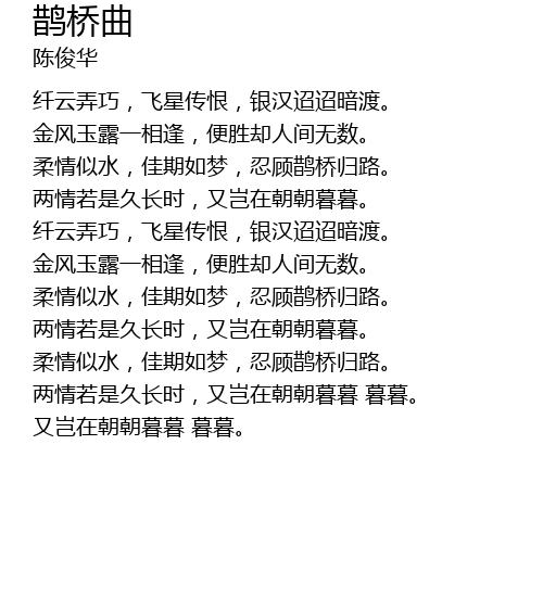 | [00:55.67] | 纤云弄巧,飞星传恨,银汉迢迢暗渡。 |