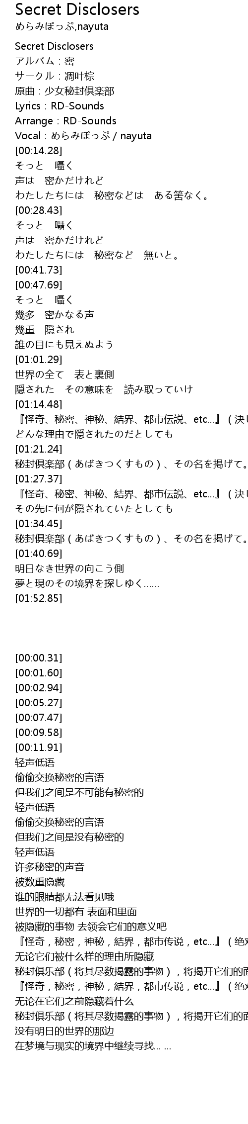 | [01:34.64] | 秘封倶楽部(あばきつくすもの)、その名を掲げて。 |