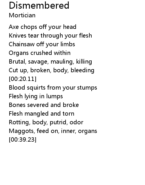| [00:16.36] | Cut up, broken, body, bleeding |