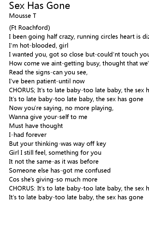 CHORUS: It's to late baby-too late baby, the sex has gone |