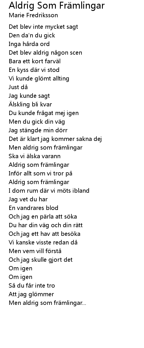 | Song | Aldrig Som Främlingar |