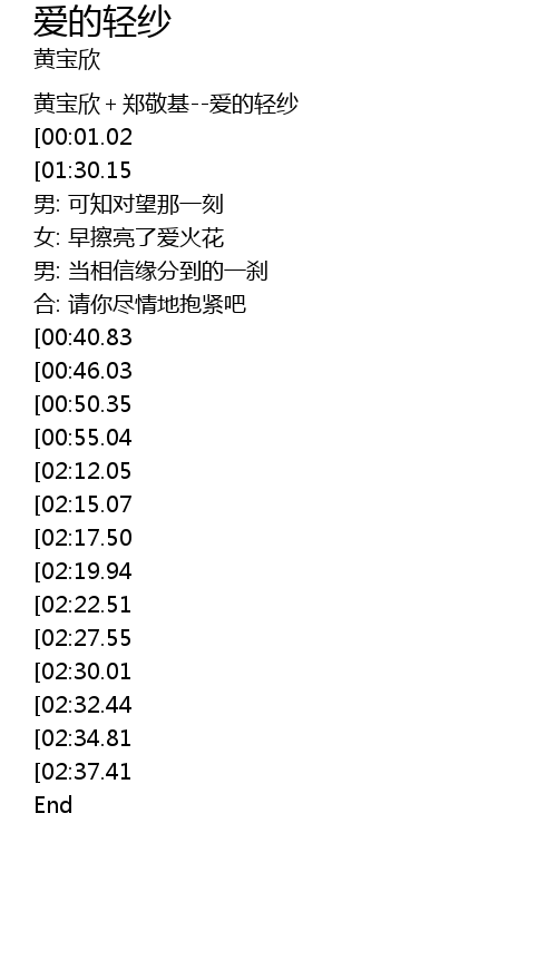 | [00:00.00] | 黄宝欣+郑敬基--爱的轻纱 |