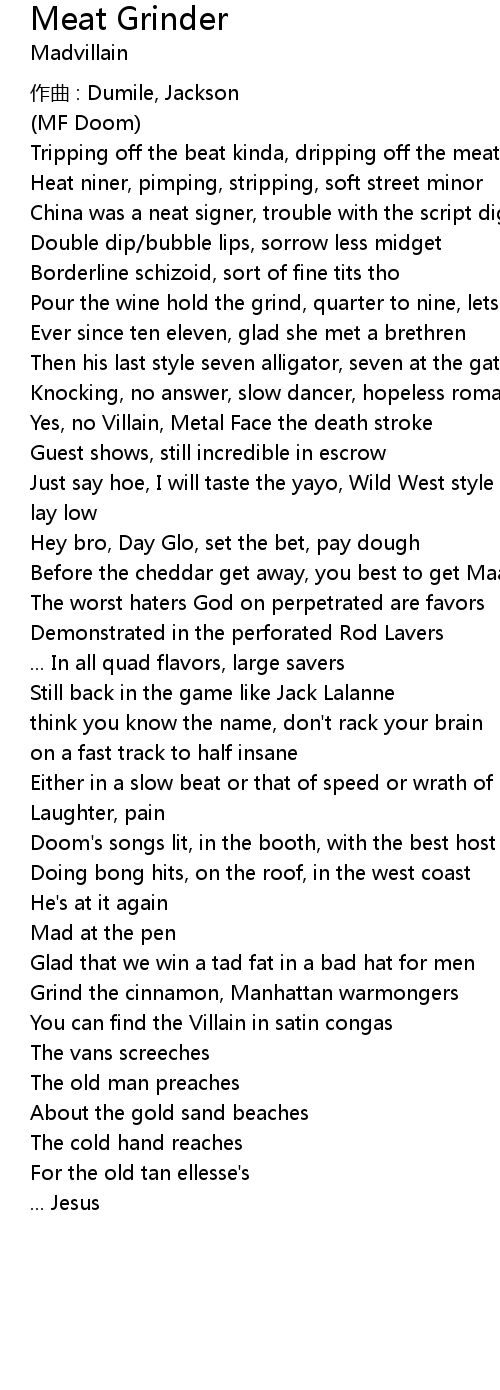 | Tripping off the beat kinda, dripping off the meat grinder | |
