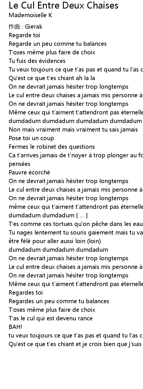 | Le cul entre deux chaises a jamais mis personne a l' aise | |