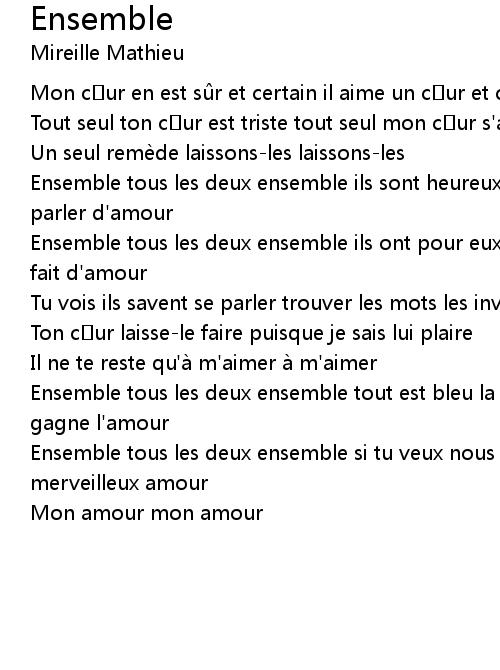 | Ensemble tous les deux ensemble ils sont heureux rien n' existe pour eux que de parler d' amour | |