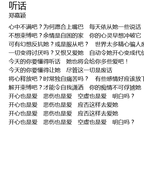 | 心中不满吧?为何愿合上嘴巴 每天依从她一些说话 | |