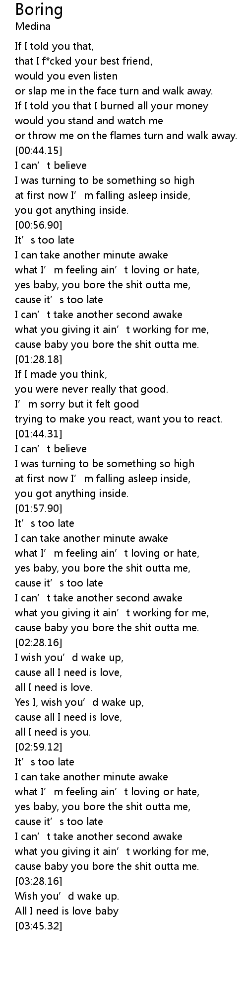 | [02:24.04] | cause baby you bore the shit outta me. |