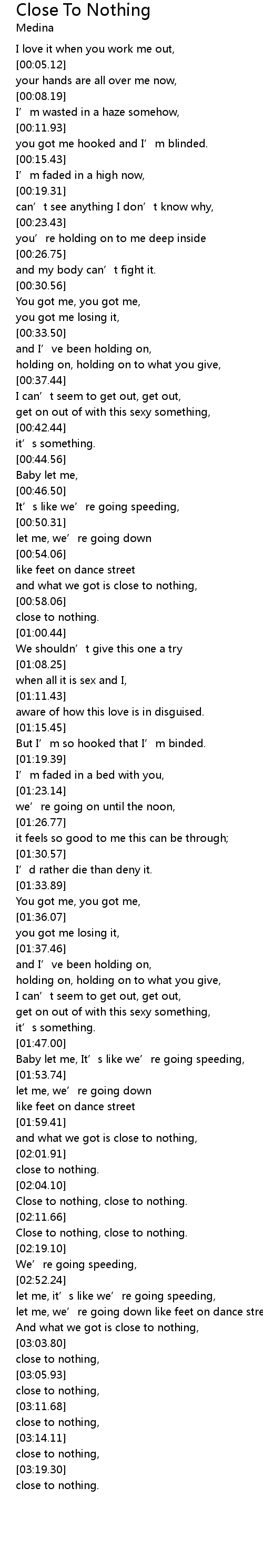 | [02:16.73] | Close to nothing, close to nothing. |
