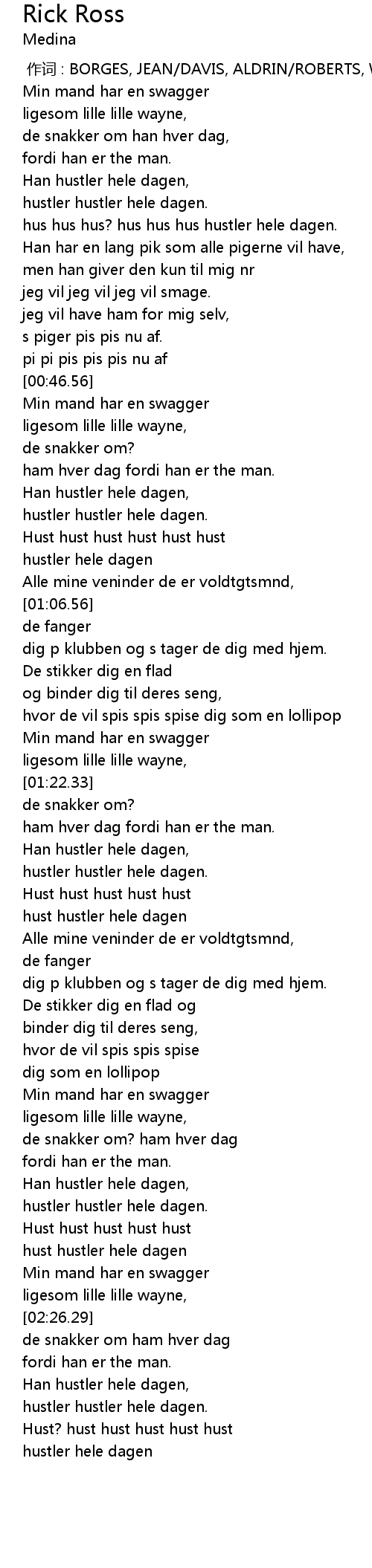 | [00:26.98] | hus hus hus? hus hus hus hustler hele dagen. |