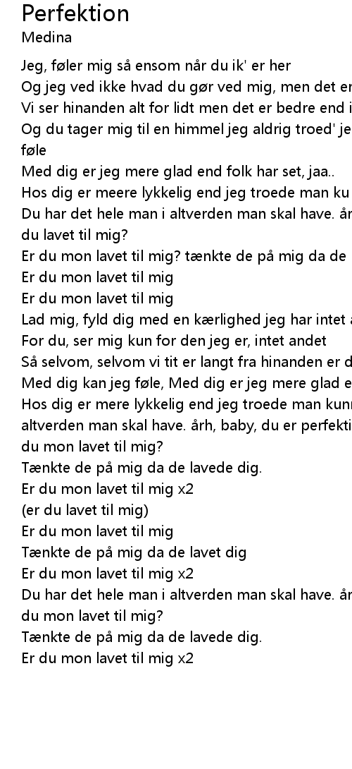 | Hos dig er mere lykkelig end jeg troede man kunne blive. du har det hele man i altverden man skal have. rh, baby, du er perfektion, er du lavet til mig? er du mon lavet til mig? | |