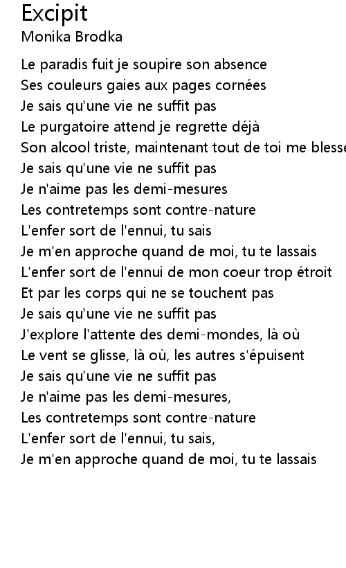| [01:58.54] | L' enfer sort de l' ennui de mon coeur trop é troit |