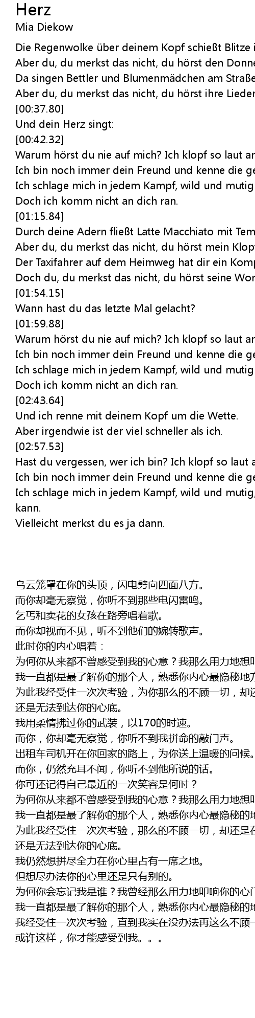 | [01:35.36] | Aber du, du merkst das nicht, du hörst mein Klopfen nicht. |