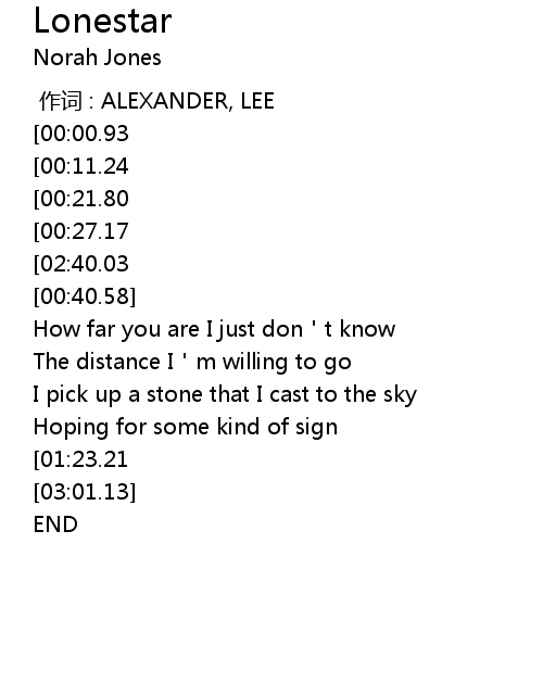 | [02:08.21][00:00.93] | Lonestar where are you out tonight? |