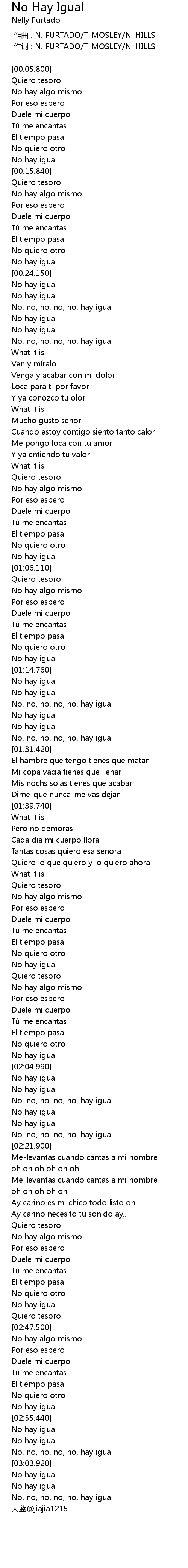 | [00:01.00] | 作词 : N. FURTADO/T. MOSLEY/N. HILLS |