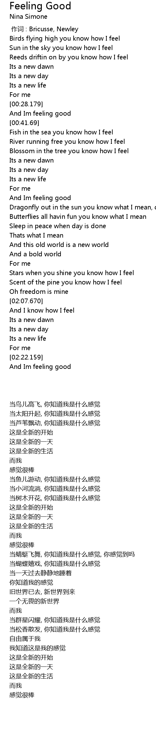 | [02:31.789] | And Im feeling good |