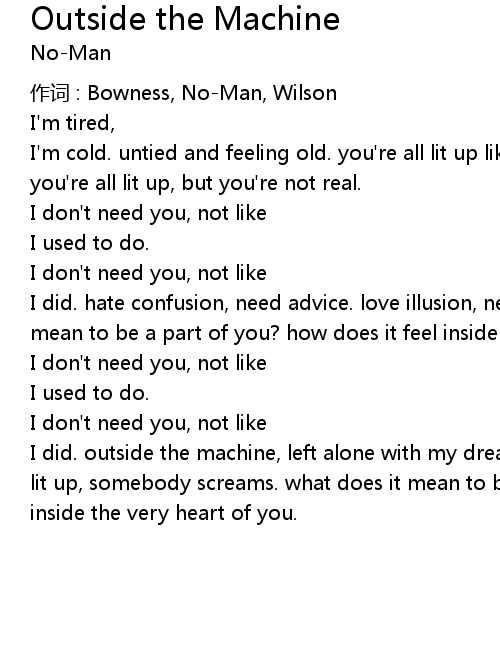 | I did. outside the machine, left alone with my dreams. outside the machine, all lit up, somebody screams. what does it mean to be a part of you? tried to get inside the very heart of you. |
