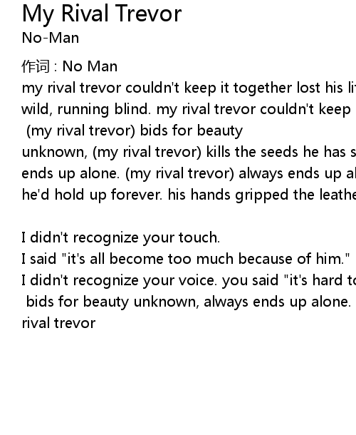 | my rival trevor couldn't keep it together lost his life to the never running wild, running blind. my rival trevor couldn't keep it together never asking me whether he'd been wasting his time [chorus:] (my rival trevor) bids for beauty unknown, (my rival trevor) kills the seeds he has sown, (my rival trevor) always ends up alone. (my rival trevor) always ends up alone. my rival trevor thought he'd hold up forever. his hands gripped the leather while his sex blew your mind. [chorus] | |