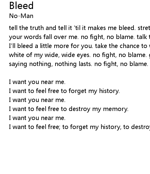 | I'll bleed a little more for you. take the chance to watch the red rise from the white of my wide, wide eyes. no fight, no blame. going nowhere, moving fast. saying nothing, nothing lasts. no fight, no blame. no search, no pain. no dream, no gain. no try, no fame. no fight, no blame. blame. [Say Baby Say Goodbye] | |
