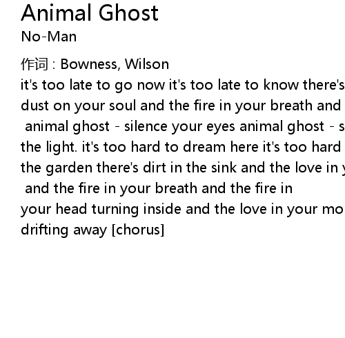 | it' s too late to go now it' s too late to know there' s food on the table there' s dust on your soul and the fire in your breath and the fire in your head turning inside chorus: animal ghost silence your eyes animal ghost sleepwalk in the light. it' s too hard to dream here it' s too hard to think there' s growth in the garden there' s dirt in the sink and the love in your mouth and the love in your heart drifting away chorus and the fire in your breath and the fire in your head turning inside and the love in your mouth and the love in your heart drifting away chorus |