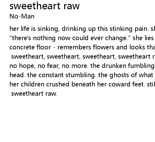 her life is sinking, drinking up this stinking pain. she gets to thinking, "there's nothing now could ever change." she lies for hours, crashed upon the concrete floor - remembers flowers and looks that left her sweet heart raw. [chorus:] sweetheart, sweetheart, sweetheart, sweetheart raw - no hope, no fear; no hope, no fear, no more. the drunken fumbling, the shaking hands and shaken head. the constant stumbling. the ghosts of what she should have said. she sees her children crushed beneath her coward feet. still not forgiven, she's broken by her heart's sweet beat. [chorus x2] sweetheart raw. |