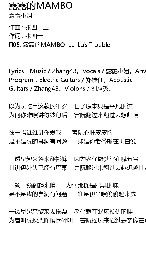 | Lyrics.Music/Zhang43。Vocals/露露小姐。Arrangement/郑捷任.Zhang43。Midi Program.Electric Guitars/郑捷任。Acoustic Guitars/Zhang43。Violons/刘应秀。 | |