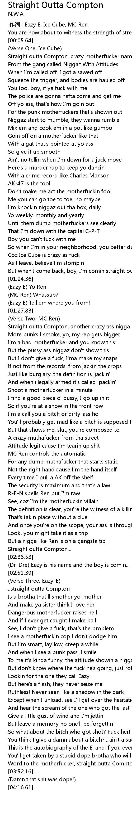 | [03:47.16] | Word to the motherfucker, straight outta Compton |