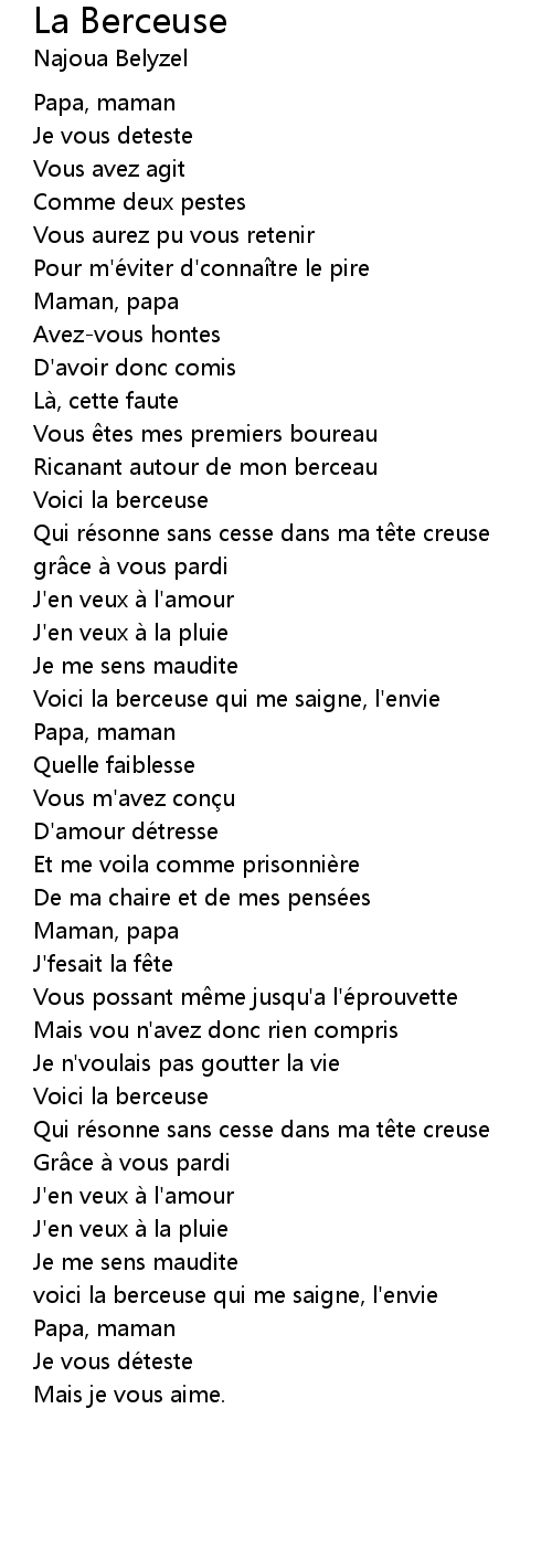 | Voici la berceuse qui me saigne, l'envie | |