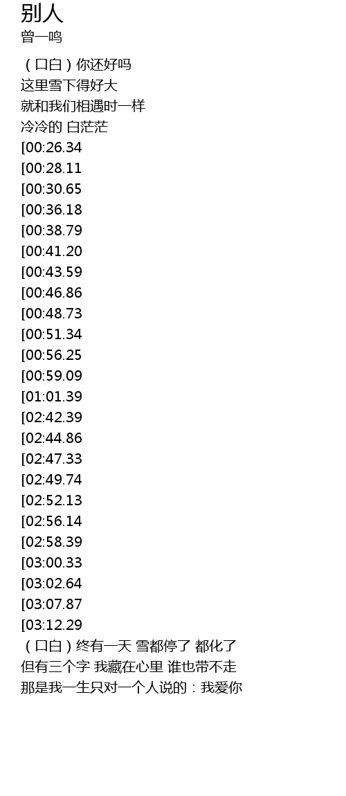 | [03:48.32][03:12.29][01:36.80] | nà bié lí de rén |