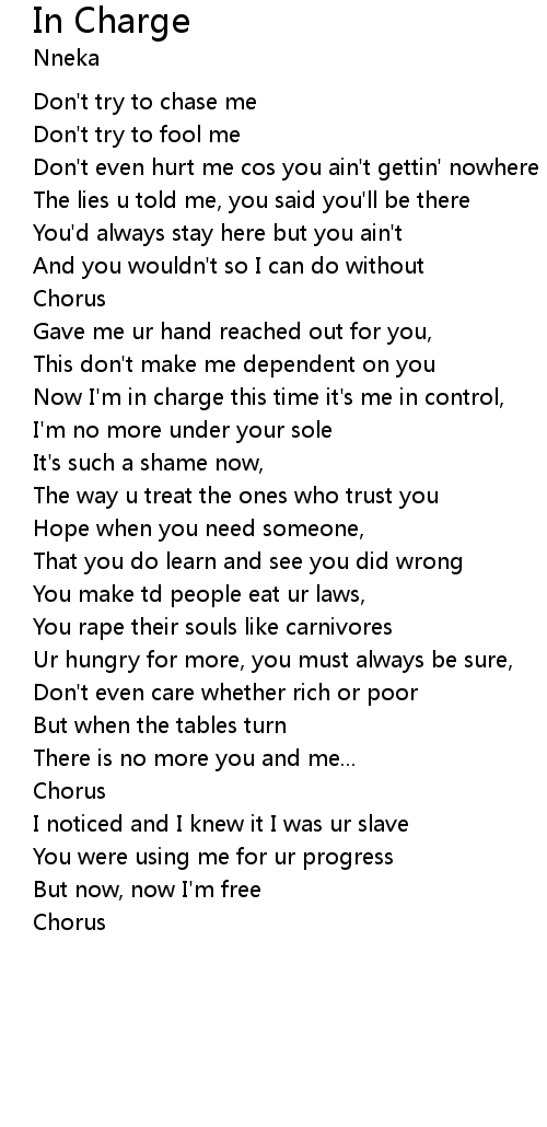 Now I'm in charge this time it's me in control, |