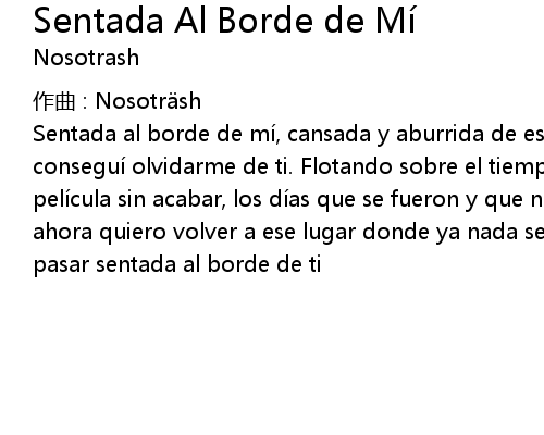 | Sentada al borde de mi, cansada y aburrida de esperar, salte y en un momento consegui olvidarme de ti. Flotando sobre el tiempo vi pasar, como en una peli cula sin acabar, los di as que se fueron y que no, que no volvera n ma s. Y ahora quiero volver a ese lugar donde ya nada se esconde, donde veo el tiempo pasar sentada al borde de ti |