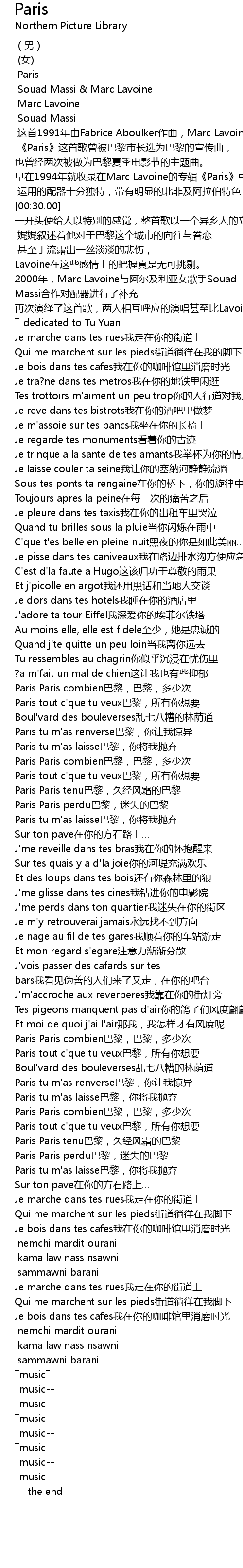 | [02:18.30] | Paris tu m'as laisse巴黎,你将我抛弃 |