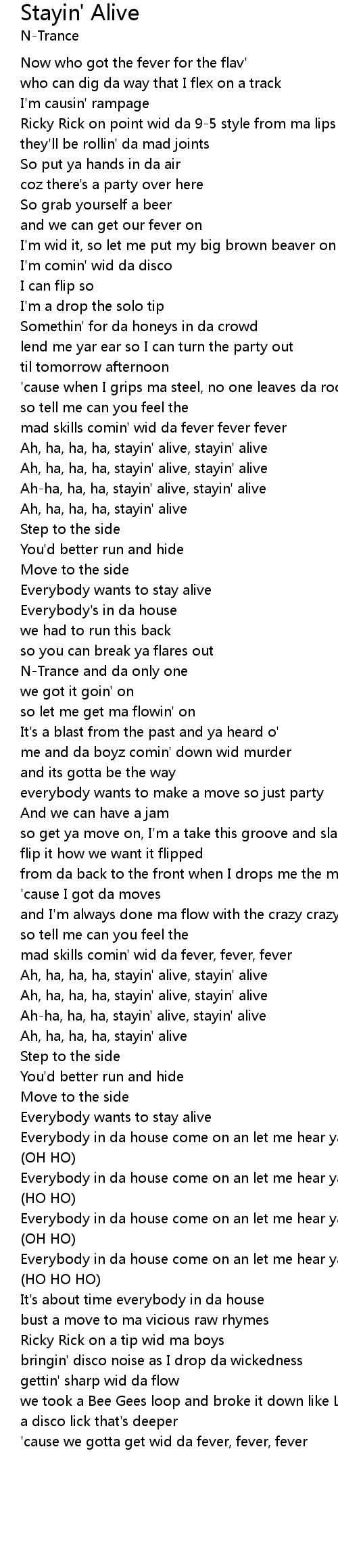 Ah-ha, ha, ha, stayin' alive, stayin' alive |
