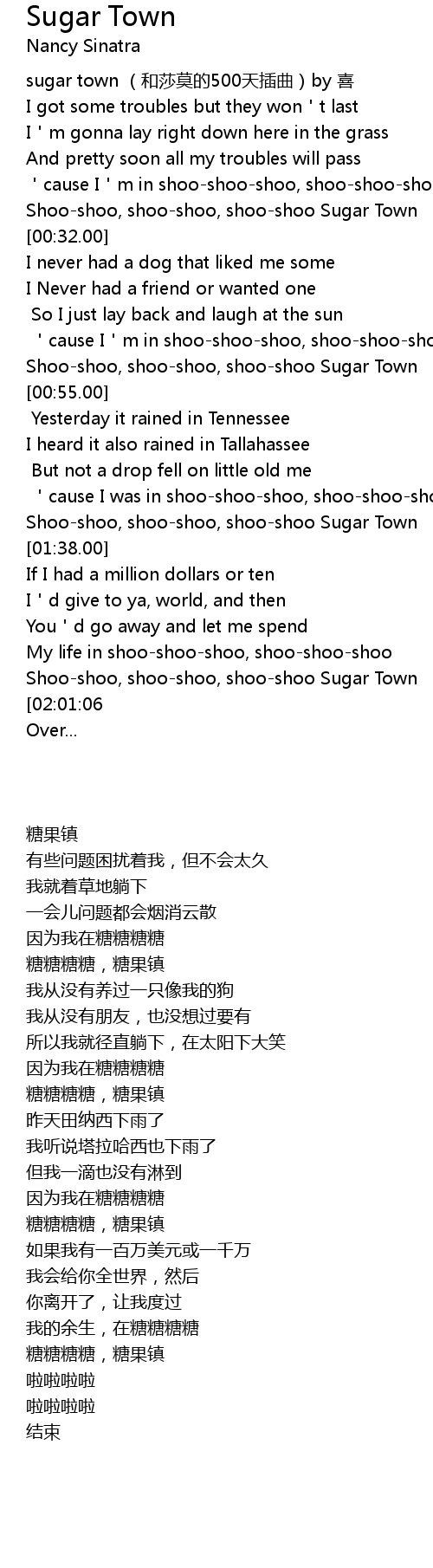 | [01:58.55] | Shoo-shoo, shoo-shoo, shoo-shoo Sugar Town |