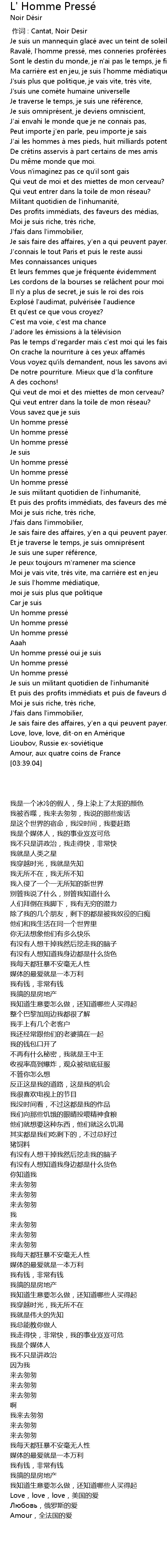 | [02:57.63] | Moi je vais vite, très vite, ma carrière est en jeu |