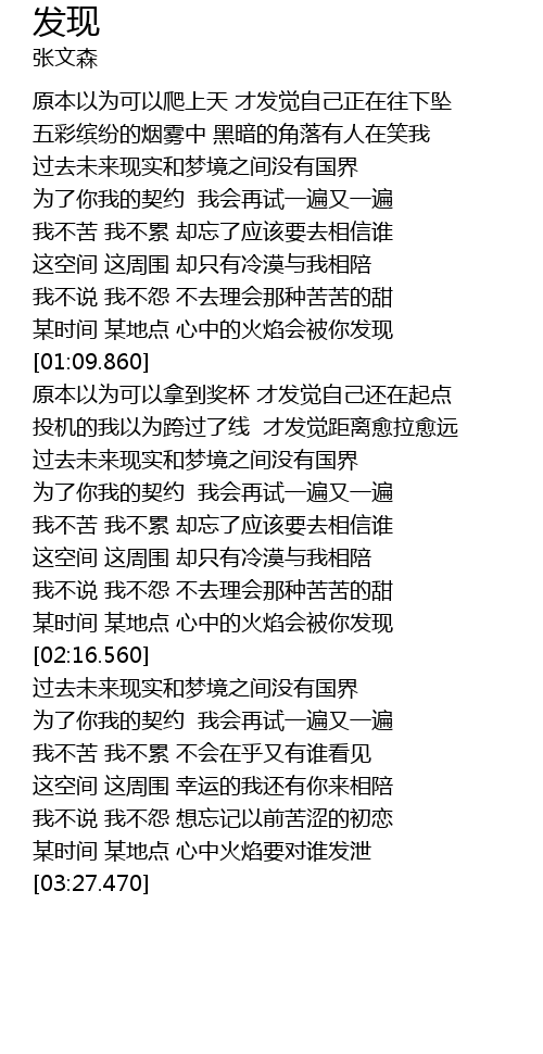 | [03:02.530] | 我不苦 我不累 不会在乎又有谁看见 |